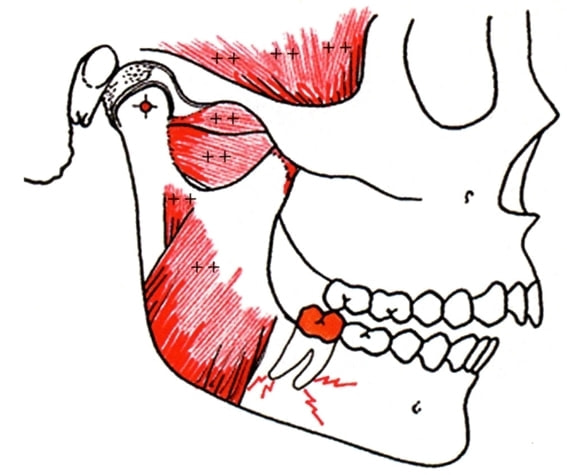 ▼ 特に下顎を前方に動かす為に位置を決める外側翼突筋が緊張します。その筋肉の緊張が他の閉口筋(内側翼突筋・咬筋・側頭筋)まで緊張が波及し、ついには口を開けることができなくなることもあります。その強直が頸部を支える筋肉、姿勢を正す背中の筋肉に波及して、肩こり、背中の痛みになり、また、筋肉からの頭痛にも関連してくるのです。